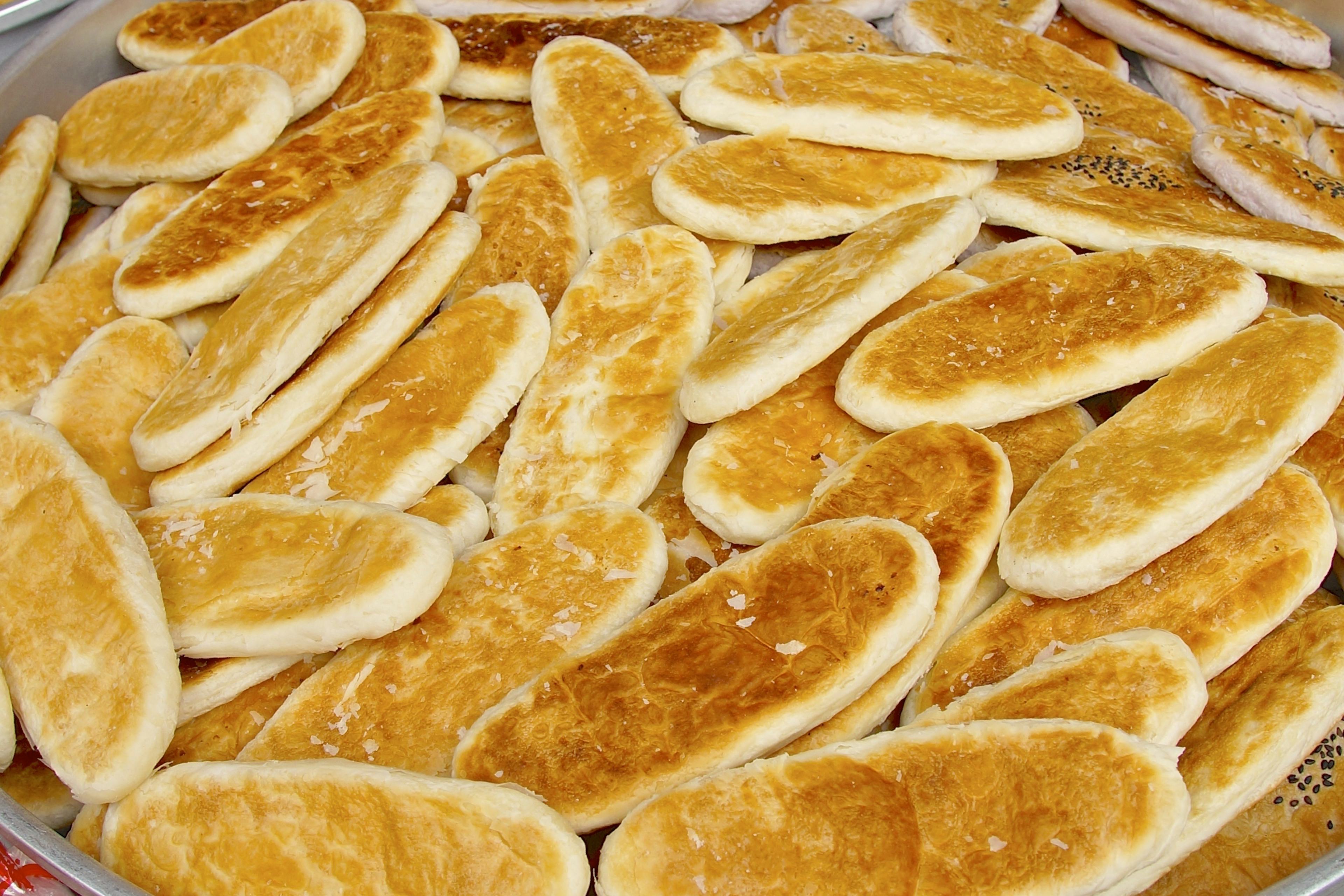 This particular pastry is shaped like an ox’s tongue. Dough is rolled into long flat strips and smeared with sauce and sesame seeds before baking.